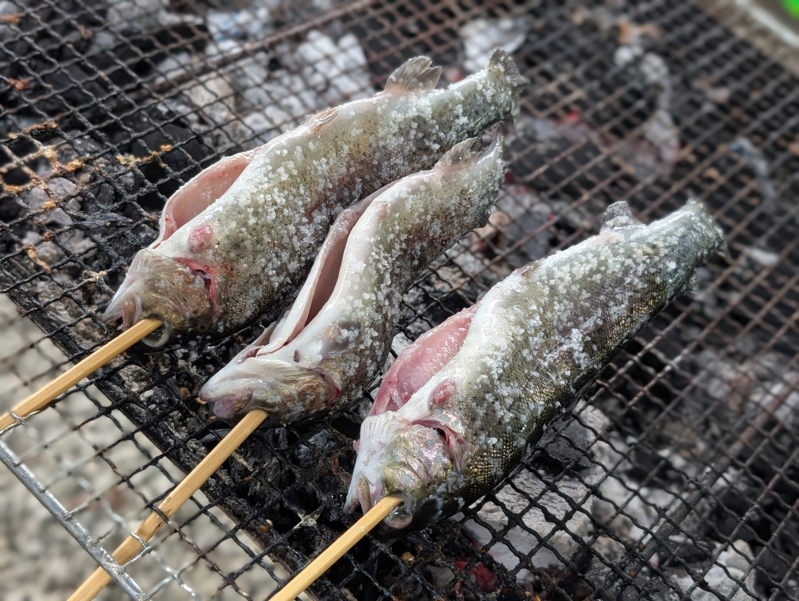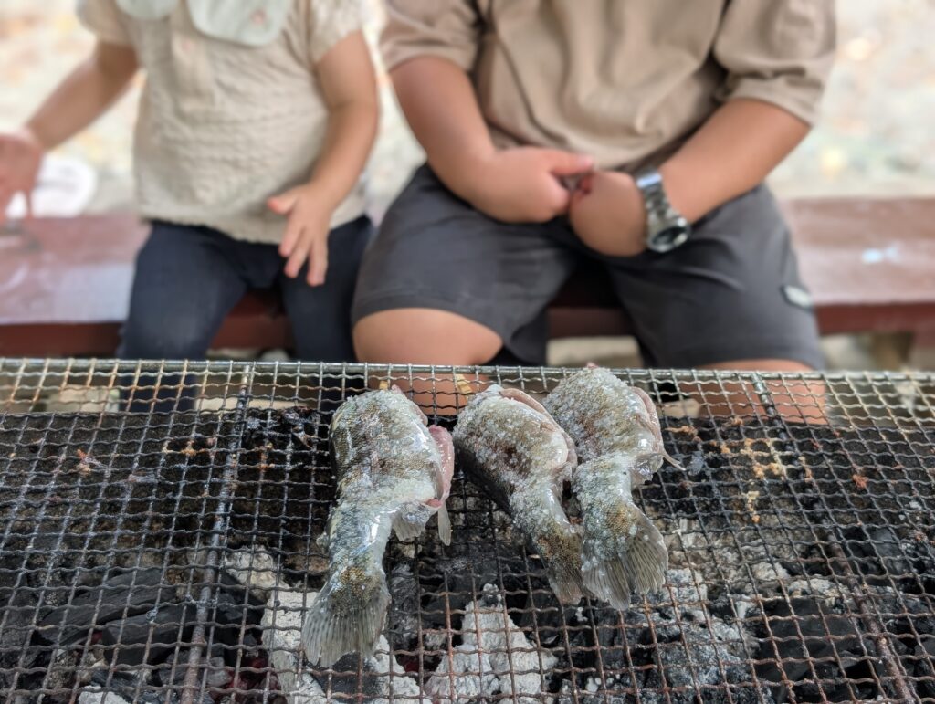 すぐ焼ける!:獲ったばかりの魚を、すぐに炭火で焼けるのが醍醐味!新鮮な魚を串に刺し、網の上で焼く香ばしい匂いは、大人も子どもも食欲をそそります。