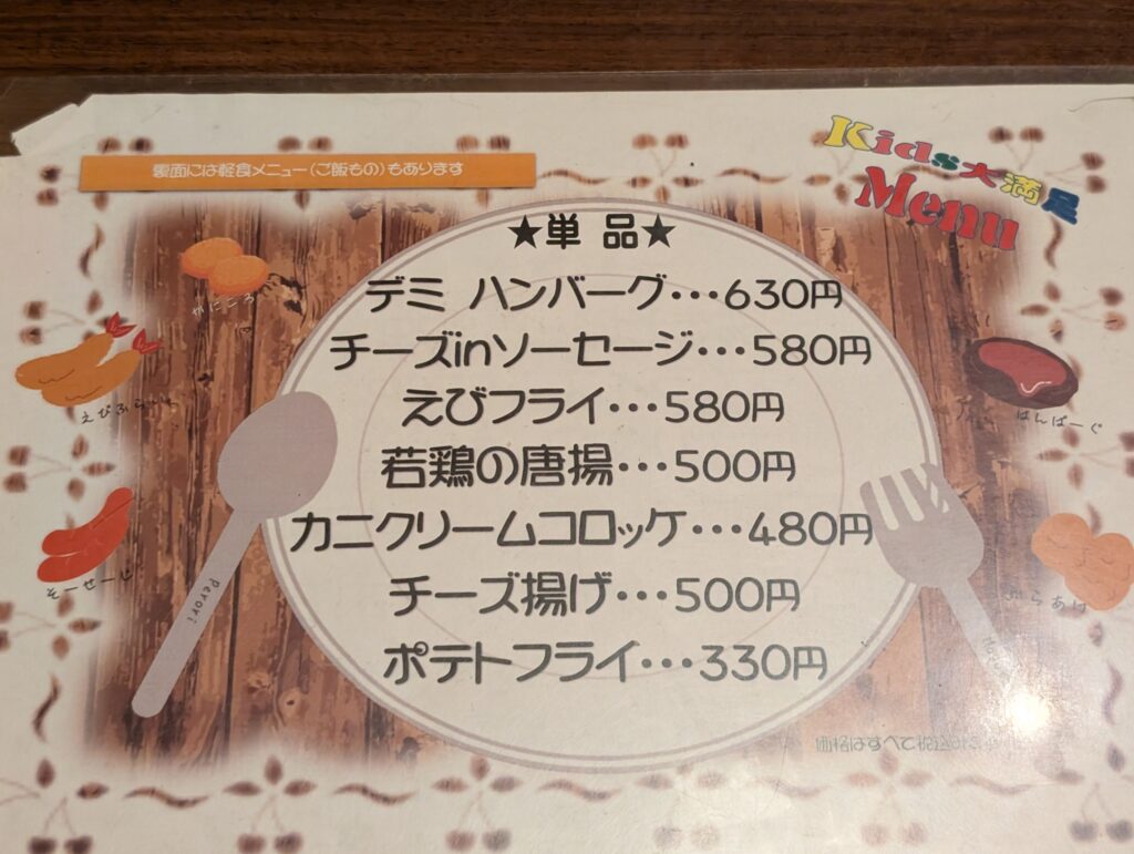 悩んだ末、息子は「牛肉のピリ辛炒め定食」娘は「デミグラスハンバーグ単品」僕は「サバの文化焼き定食」を注文しました。あと、僕も息子もカキフライ定食と悩んだので、カキフライ単品をちゅうもんしました。